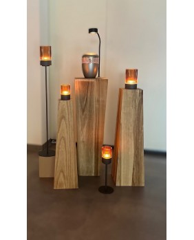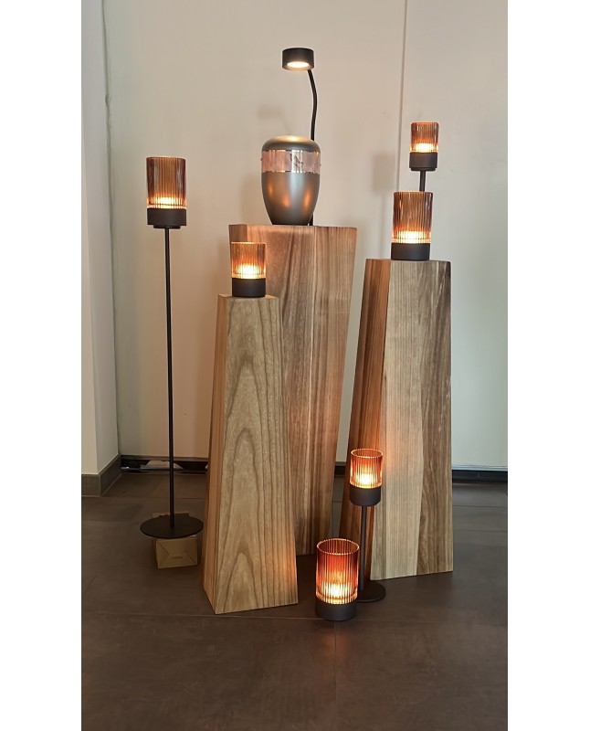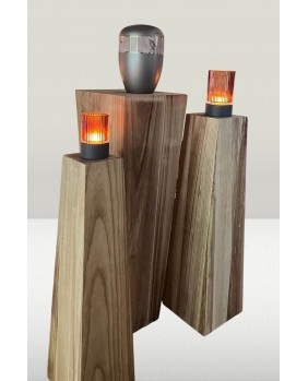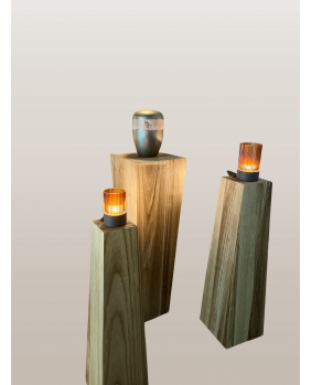 Die Holzsockel haben eine helle, natürliche Maserung und stehen frei auf einem dunklen Fliesenboden. Zwischen den Windlichtern ist mittig ein silberfarbener, glänzender eine Urne platziert (ohne Postament und Ständerwerk)