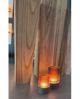 Das Bild zeigt eine dekorative Anordnung von mehreren Windlichtern auf Holzsockeln unterschiedlicher Höhe. Die Windlichter bestehen aus geriffelten Glaszylindern, die ein warmes, orangefarbenes Licht ausstrahlen. Dadurch entsteht eine gemütliche, ruhige Atmosphäre.