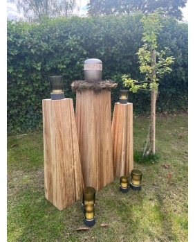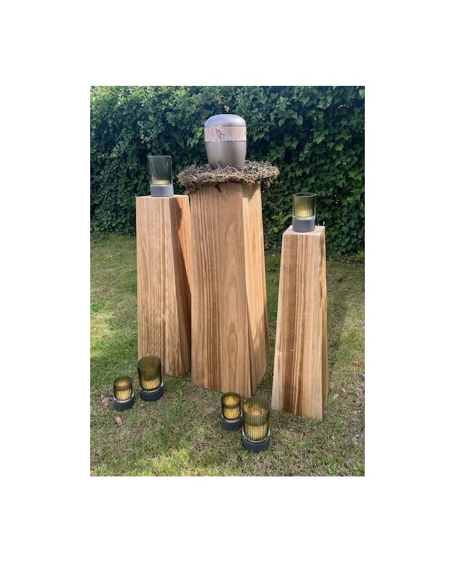 Das Bild zeigt eine dekorative Anordnung von mehreren Windlichtern auf Holzsockeln unterschiedlicher Höhe. Die Windlichter bestehen aus geriffelten Glaszylindern, die ein warmes ,smarakt Licht ausstrahlen. Dadurch entsteht eine gemütliche, ruhige Atmosphäre.